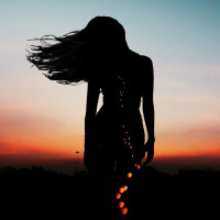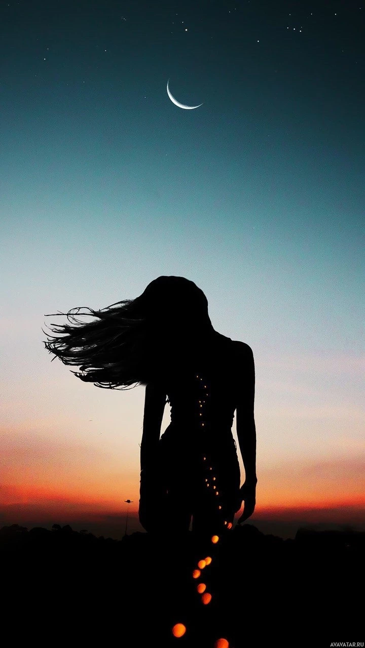 На картинке изображен силуэт женщины, стоящей на фоне того, что кажется пляжем или прибрежной зоной на восходе или закате солнца, учитывая теплое освещение и серповидную луну, видимую в небе. Рядом с ее ногами также есть искры, которые можно интерпретировать как светлячки или биолюминесценцию. Стиль изображения кажется художественным с наложением, которое может предложить мечтательный или фэнтезийный элемент.