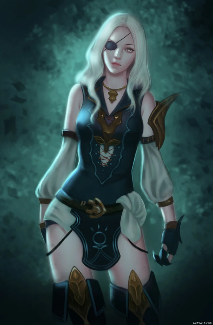 white hair, is wearing a dark blue and gold armor with a high collar and a helmet that obscures her face, and she's holding what looks like a weapon in her left hand. She has
