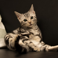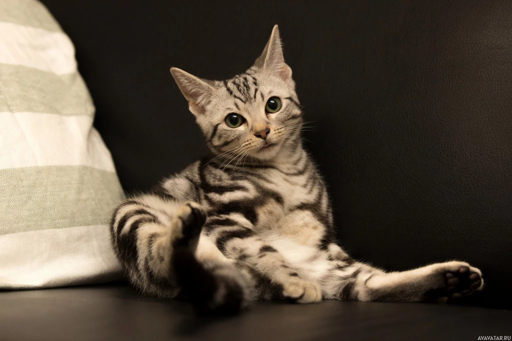 На картине изображен маленький кот, сидящий на диване с вытянутыми перед ним задними лапами. Кошка кажется расслабленной и комфортной. Он имеет полосатую шерсть, которая типична для бенгальских или подобных пород.