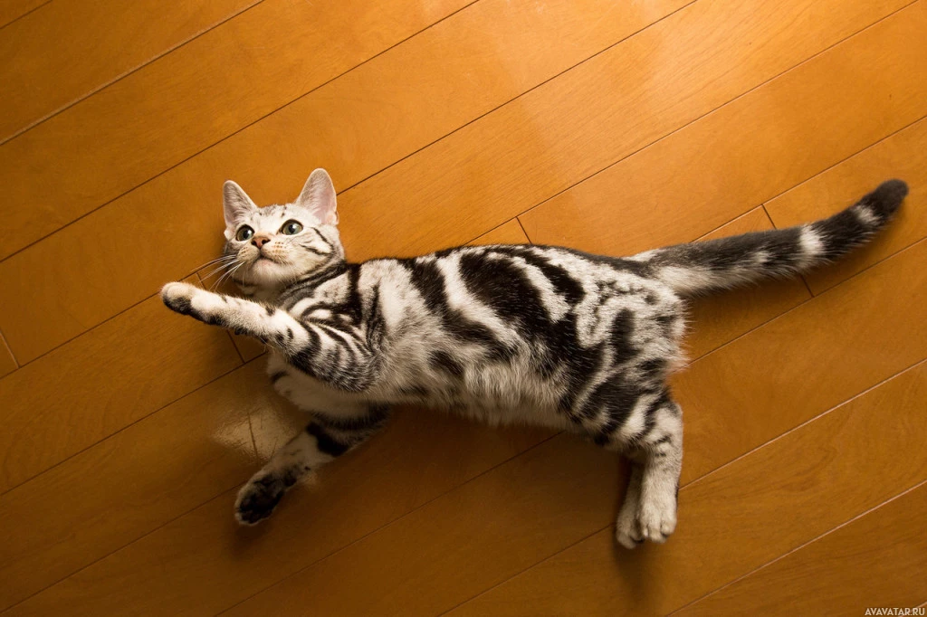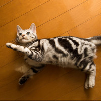 The image shows a cat lying on its back with all four legs extended outwards. It appears to be relaxed and may be in a playful or resting pose, commonly known as "belly up." This posture can indicate that the cat is comfortable in its environment or is seeking attention from its owner or viewer. The cat has a distinctive