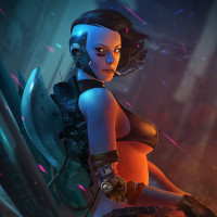 a female character who appears to be a science fiction-themed warrior or heroine. She has blue skin, is wearing