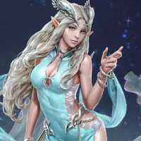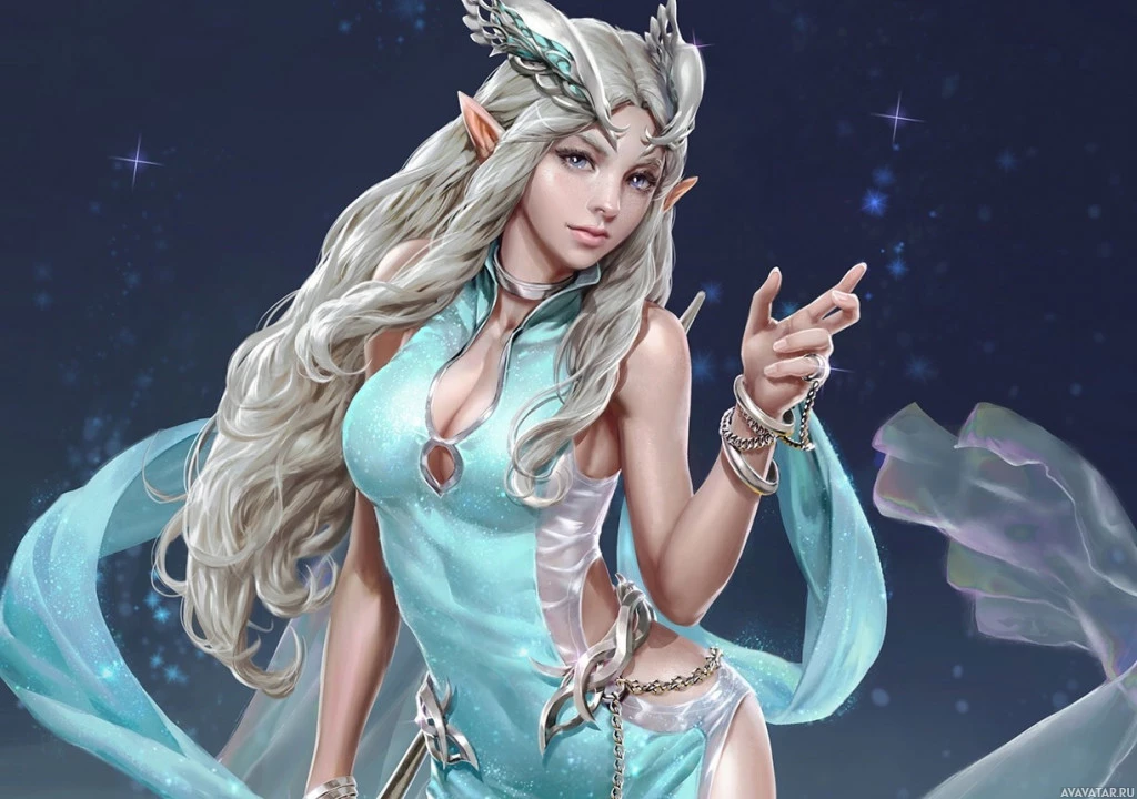 blonde hair with what looks like a feather or wing design on one side, suggesting she might have some sort of magical or ethereal abilities. Her outfit is blue and white, adorned with accents that give it an elven or mystical appearance. The background is starry, which adds to the fantasy theme of the image. The character is posing in a way that suggests she's confident and poised.