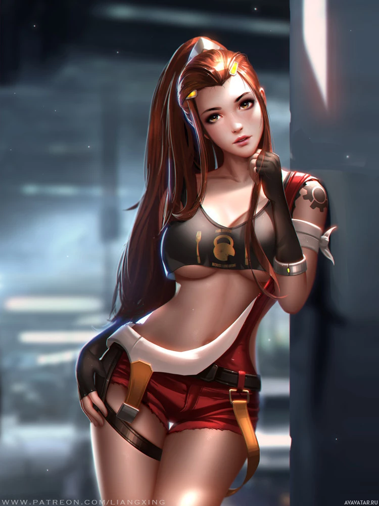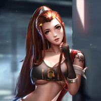 red hair and is wearing what looks like a stylized outfit, including a tank top with a symbol resembling a lock on it. The character is also holding what looks like a weapon, suggesting she is part of a team or squad within the context of the game. Her pose and expression are confident and composed, which is consistent with her character's persona in "Overwatch."