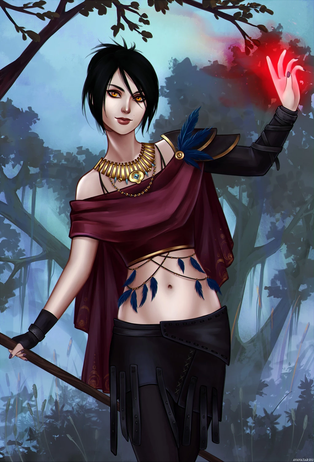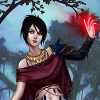 a red crystal or gem. The background suggests a magical or mystical environment, possibly indicating the character's powers or
