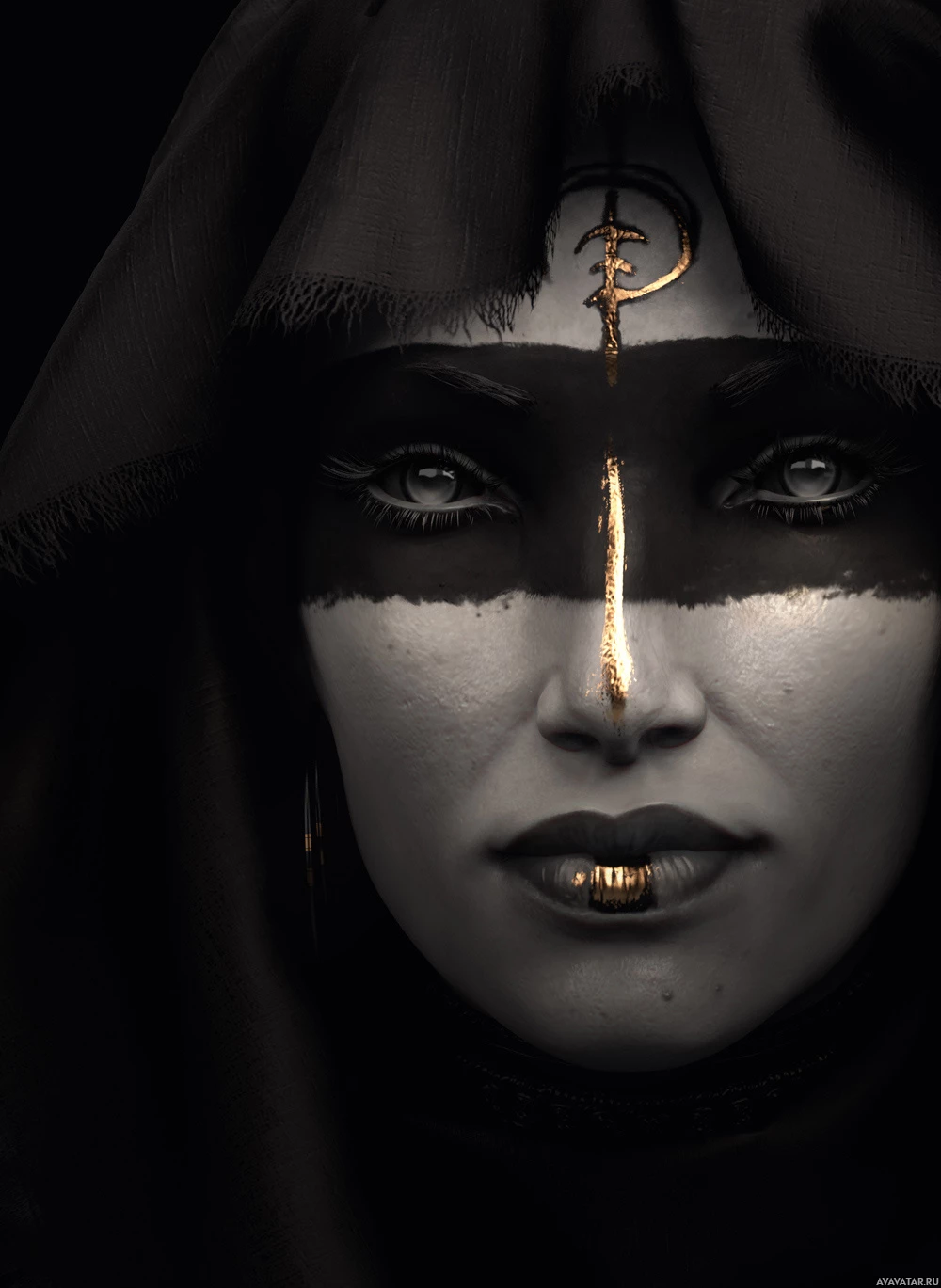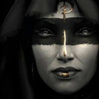 a symbol on the forehead of the mask that resembles an inverted cross. The overall style of the image suggests a fantasy or supernatural theme.