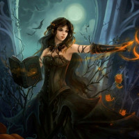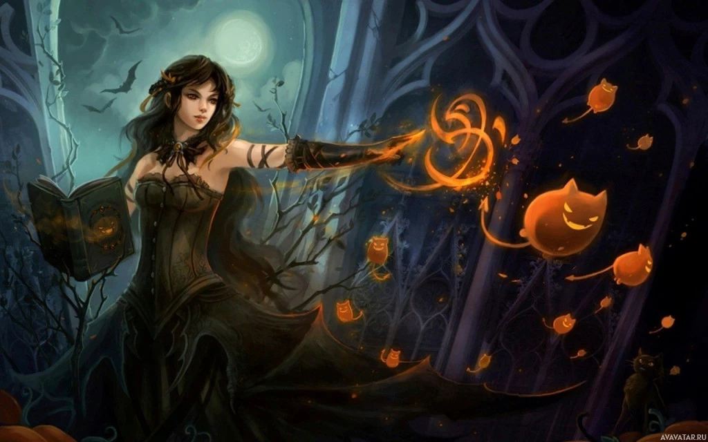 Halloween decorations such as pumpkins and bats, which contribute to the festive or spooky atmosphere of the scene. The style of the image is reminiscent of traditional fantasy artwork.