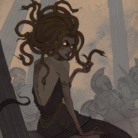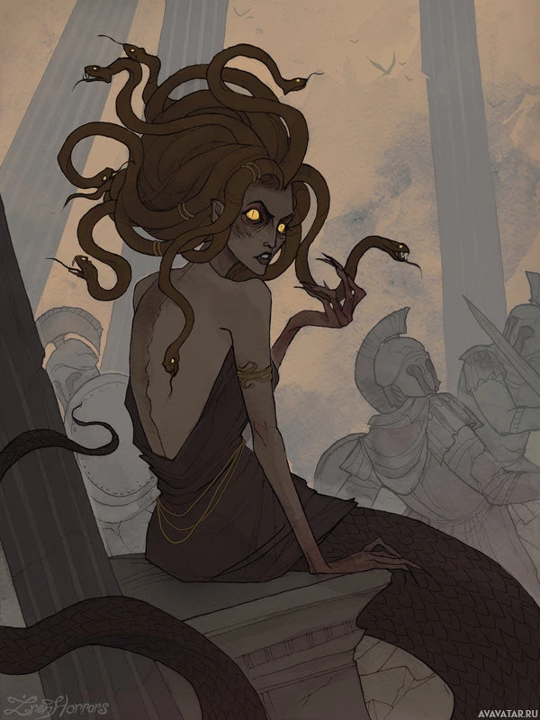 a fantasy scene featuring Medusa, the Greek mythological figure known as a Gorgon. She is shown from behind, wearing a dress and looking over her shoulder with