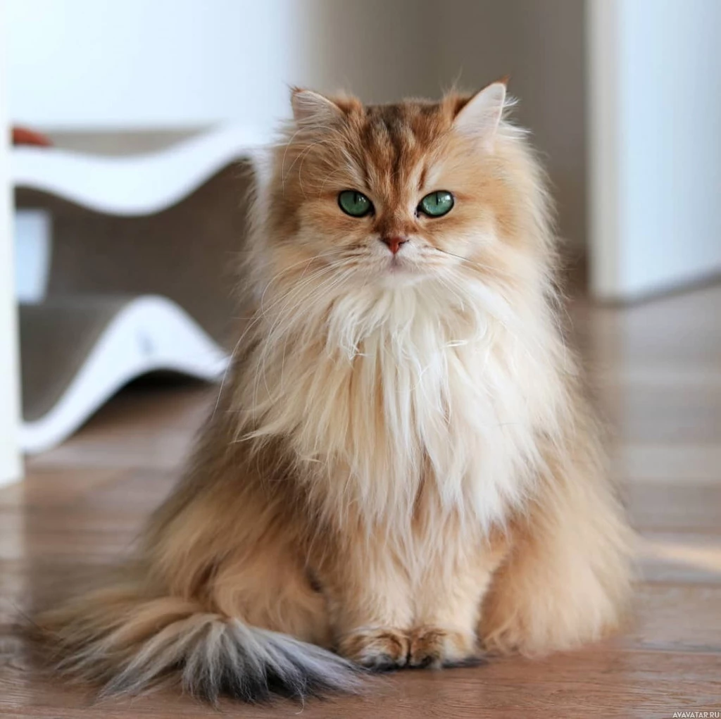 a long coat sitting on a wooden floor. The cat has distinctive features including long fur,