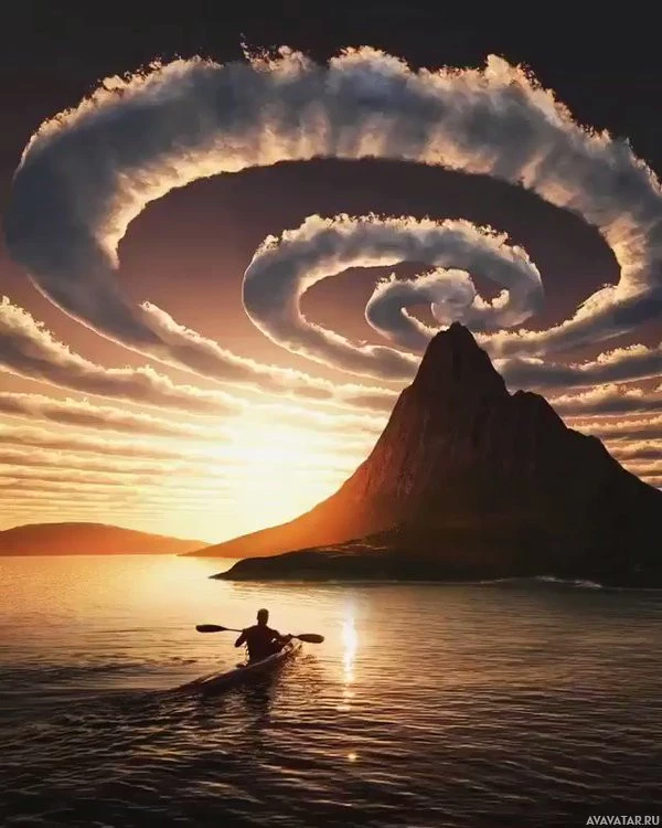 dramatic clouds that are arranged to form a swirl or vortex pattern above the mountain. This creates an almost mystical and powerful