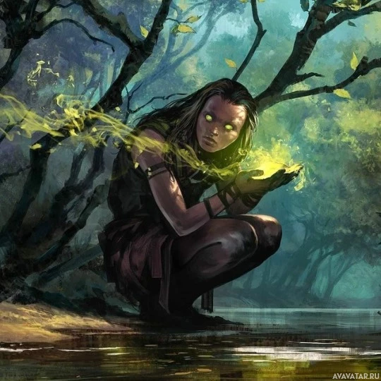 object close to their face as if inspecting it. They have wild hair and are wearing what looks like a dark outfit, which could suggest they might be a wanderer or someone of significance within this