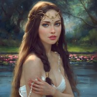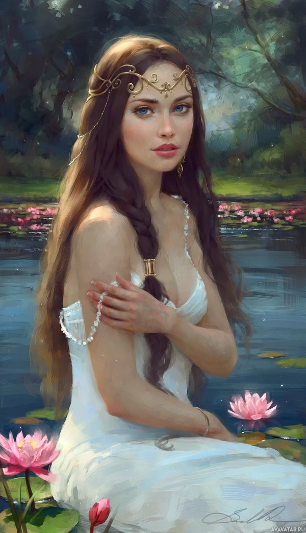 The image depicts a painting of a woman who appears to be from a fantasy or