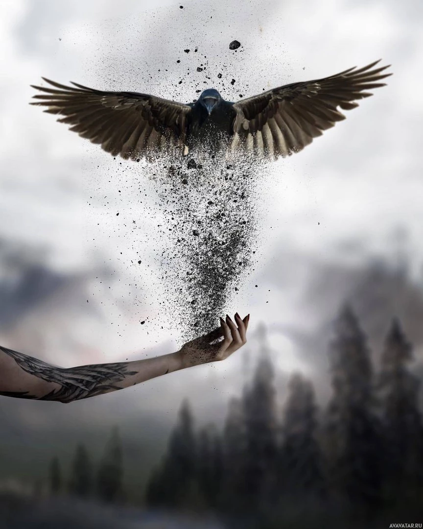 moody atmosphere. The presence of "animal," "bird," and "hand" in your description accurately describes the elements present in the picture.
