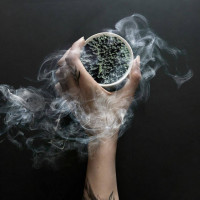 the ground tea, creating a mystical or magical effect around the cup. This might suggest that the tea has been ignited or is being burned, adding an element of surprise or danger to the image.
