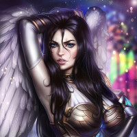 The image features an illustrated character that resembles a fantasy angel. She has wings and is adorned with what appears to be armor, suggesting she might be depicted as a warrior or guardian archetype. The artwork is rich in detail and color, capturing a sense of mystique and otherworldly allure.