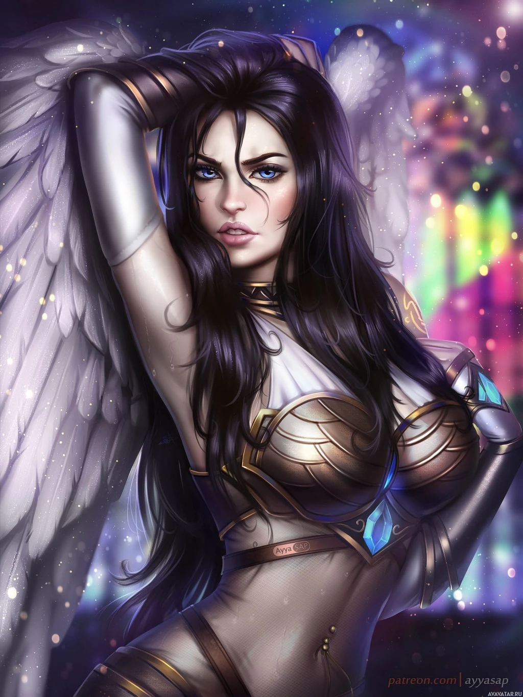 На картинке изображен иллюстрированный персонаж, напоминающий ангела фэнтези. У нее есть крылья, и она украшена тем, что кажется доспехами, предполагая, что она может быть изображена как воин или архетип хранителя. Произведение богато деталями и цветом, захватывая чувство таинственности и потустороннего очарования.