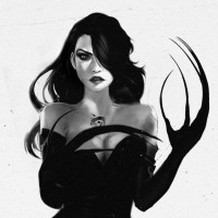 dark hair and is wearing a black dress with gloves that have spiky designs on them. Her expression seems to be one of anger or intensity. The artwork appears to be in