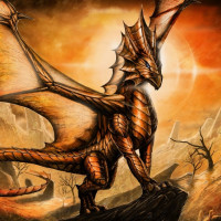 The image depicts a fantastical creature that resembles a dragon. It has the typical characteristics of a dragon, such as scales, wings, and a tail. This dragon is set against an atmospheric background with warm colors, which suggests a desert or volcanic environment. The artwork likely falls under the genre of fantasy or mythical creatures in art.