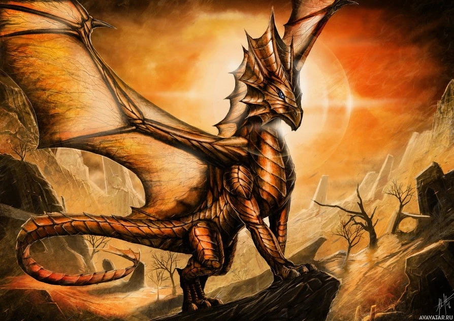 На картинке изображено фантастическое существо, напоминающее дракона. Он имеет типичные характеристики дракона, такие как чешуя, крылья и хвост. Этот дракон расположен на атмосферном фоне с теплыми цветами, что говорит о пустыне или вулканической среде. Произведения искусства, вероятно, подпадают под жанр фэнтези или мифических существ в искусстве.