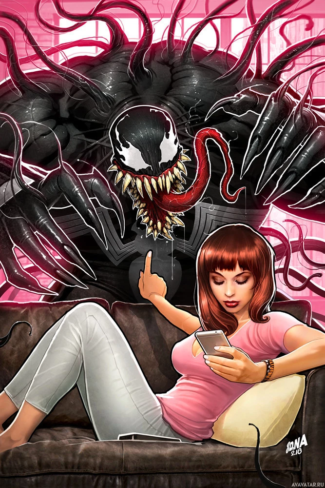 a fictional character from the Spider-Man comics and films. Venom is seen as an antagonist, but in this image, he appears to be sitting on a couch next to Mary