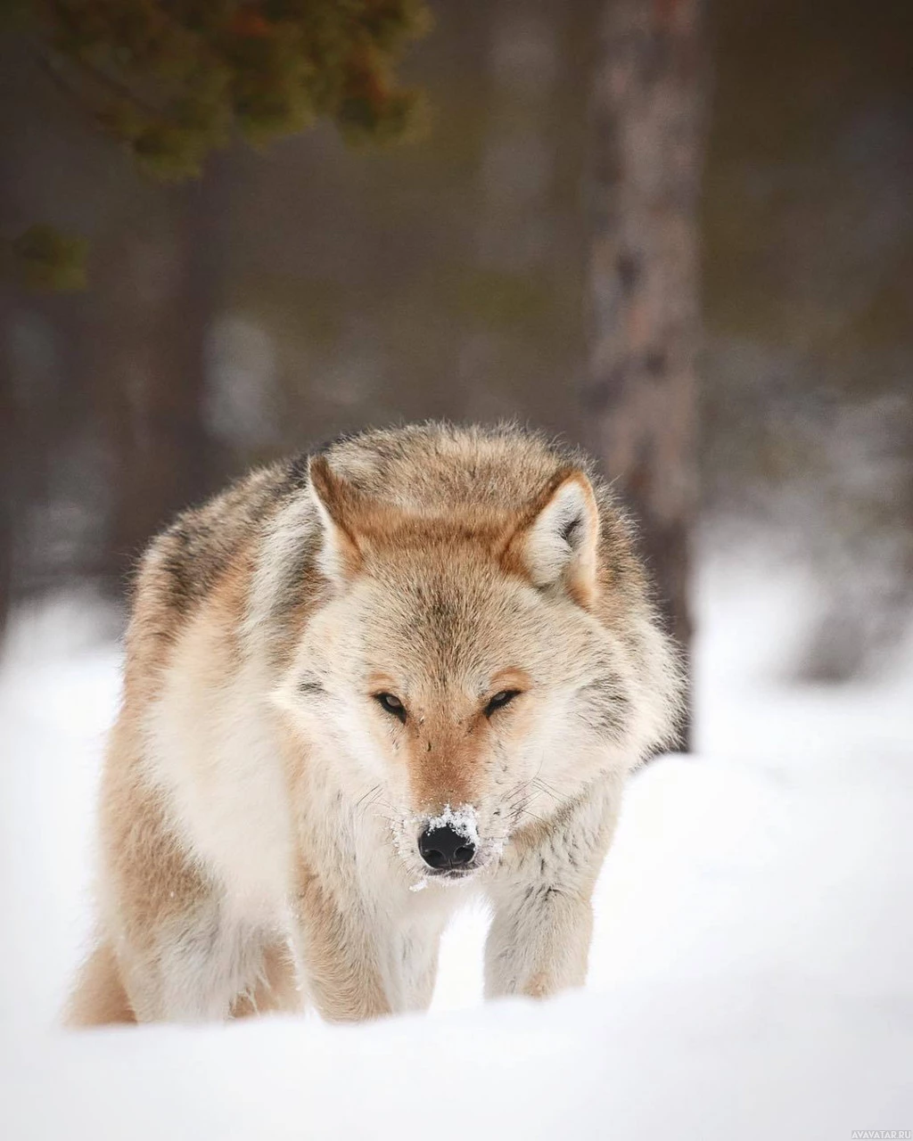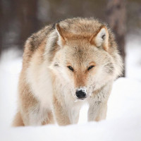 На картине изображен волк. Волк, кажется, находится в естественной среде со снегом на земле, предполагая, что это может быть зима или ранняя весна. Волк идет и, кажется, смотрит вниз, возможно, на что-то на земле или отслеживает его запах. Изображение отражает красоту и дикую природу этого животного в естественной среде обитания.