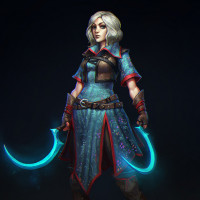 blonde hair and is wearing a blue outfit with what looks like magical energy or particles emanating from it, suggesting she might have some sort of magical ability or weapon. She also has an expression of focus or determination on her face, which could indicate that she is preparing for battle or