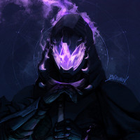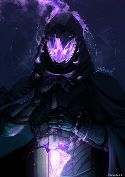 The image depicts a fantasy-themed character wearing a hood. The character has an ominous appearance with a mask that covers the face, and there are glowing