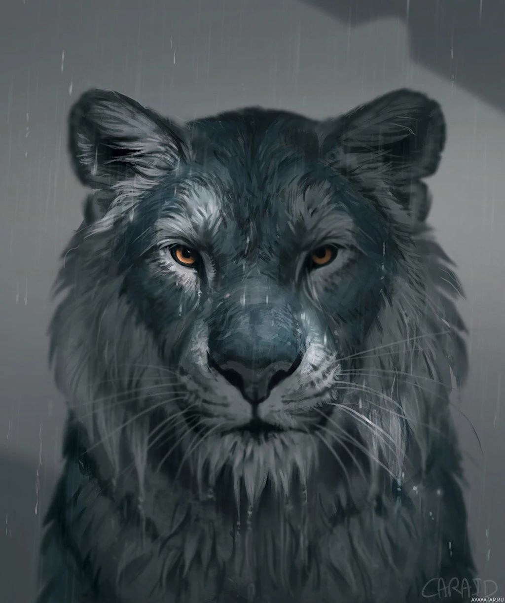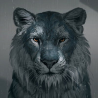 shades of gray and blue. The tiger's eyes are open wide, giving it
