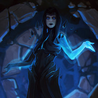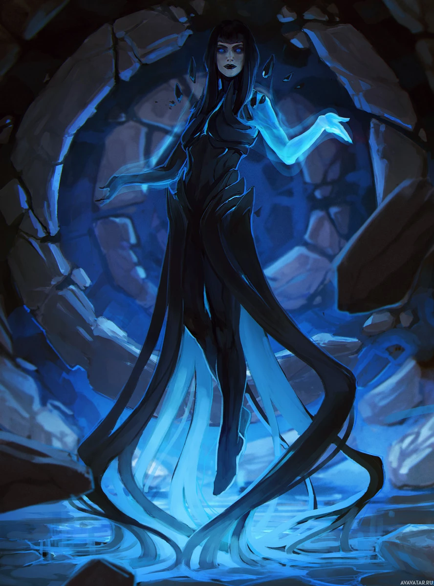 dark hair, and her attire suggests she might be a witch or a mystical figure due to the cloak-like garment she's wearing. She stands in what looks like an underground cave or subterranean setting, evidenced by the rocky walls and blue lighting that gives off