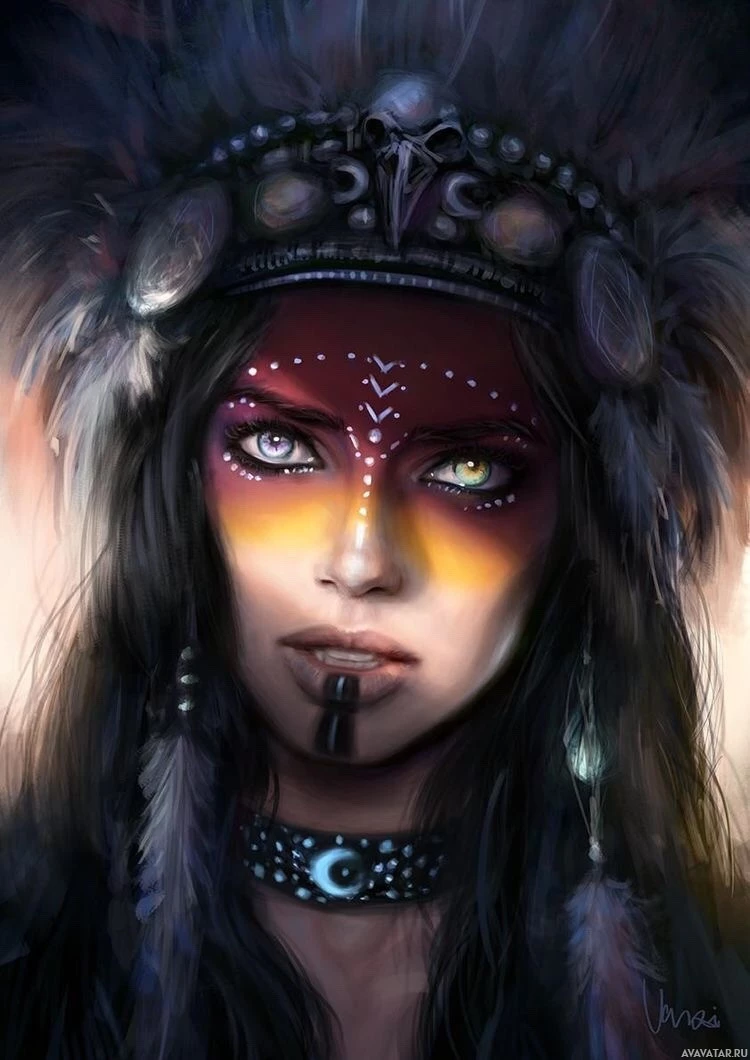 various adornments and makeup that appear to be inspired by Native American or tribal aesthetics. They have