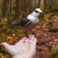 The picture features a small, grey and white bird with black markings on its wings and tail perched on someone's open hand. This is likely an image of a wildlife interaction where the person is holding out their palm to allow the bird to land and rest there for a short period.