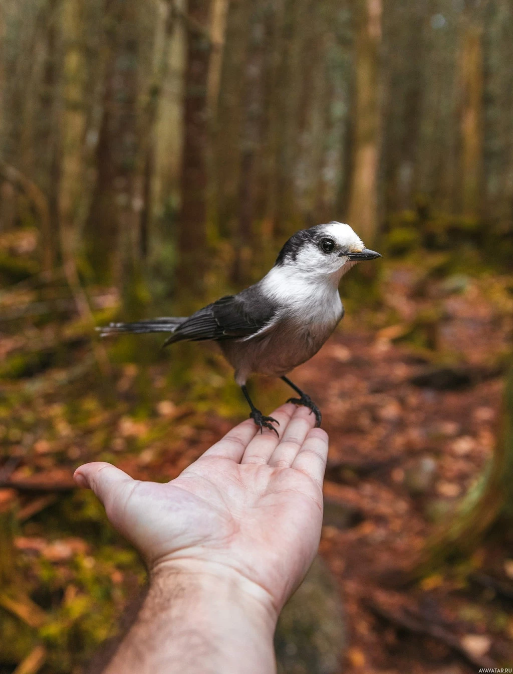 На картине изображена маленькая серая и белая птица с черными отметинами на крыльях и хвостом, прижатым к чьей-то открытой руке. Это, вероятно, изображение взаимодействия с дикой природой, где человек держит свою ладонь, чтобы птица могла приземлиться и отдохнуть там в течение короткого периода времени.