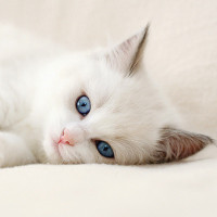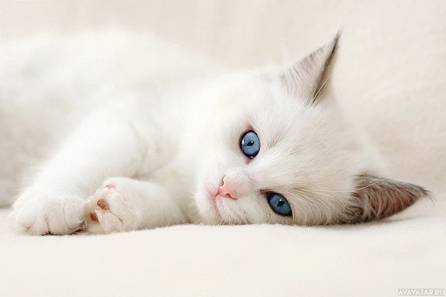 На картинке изображена молодая кошка с белым мехом и яркими голубыми глазами. Похоже, что он удобно лежит на мягкой поверхности, которая может быть одеялом или подушкой.