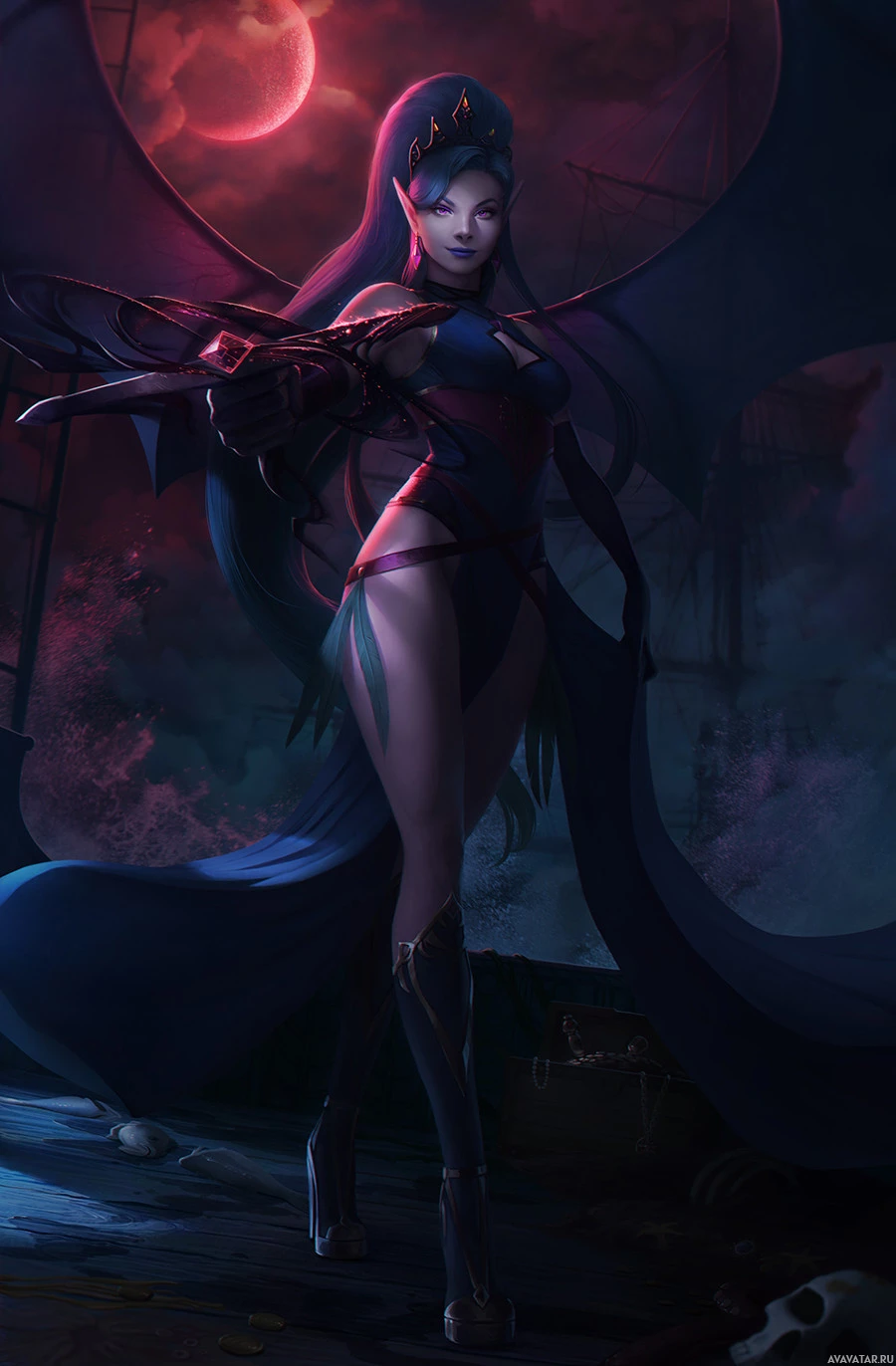 blue hair and is dressed in an elaborate outfit with elements of fantasy design, such as armor pieces and what appears to be magical or mystical accessories. The setting suggests
