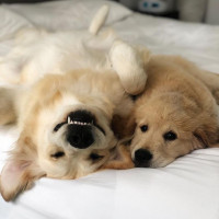 golden retrievers lying together on a bed. One of the dogs has its mouth open and appears to be in mid-yawn or possibly making a playful sound, while the other dog is laying comfortably next to it. Both dogs have their