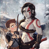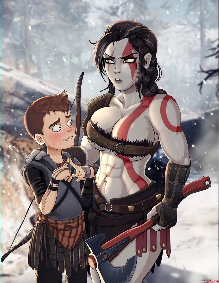 a female warrior known for her role in "God of War" video games. She's depicted wearing armor and carrying a staff, which are characteristic elements of her appearance in
