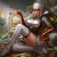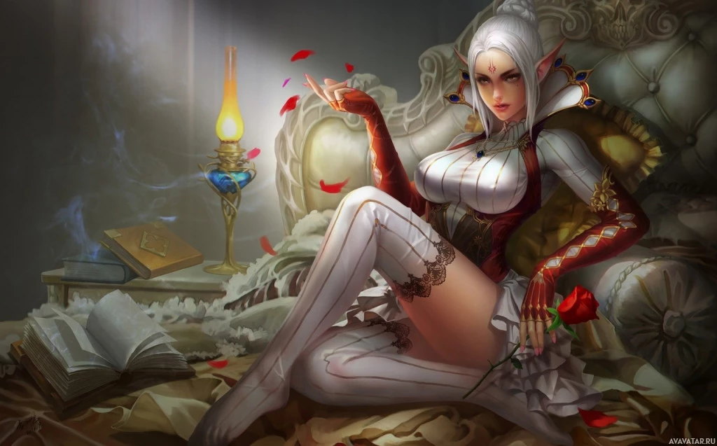 red accents and what looks like a crown of feathers on her head. The setting includes a couch and a book, suggesting a relaxed yet regal atmosphere. There are roses scattered around the room, which adds to the romantic and fantasy