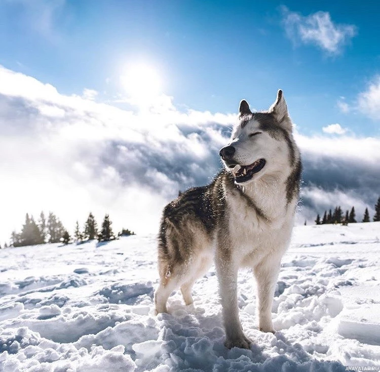 The picture shows a dog, specifically identified as an Alaskan Malamute or Husky breed, standing in the snow on what appears to be