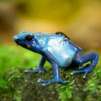 На картинке изображена синяя лягушка с более темными отметинами на спине, сидящая на покрытой лишайником скале. Похоже, что это снимок крупным планом, который подчеркивает детали и цвет амфибии на естественном фоне.