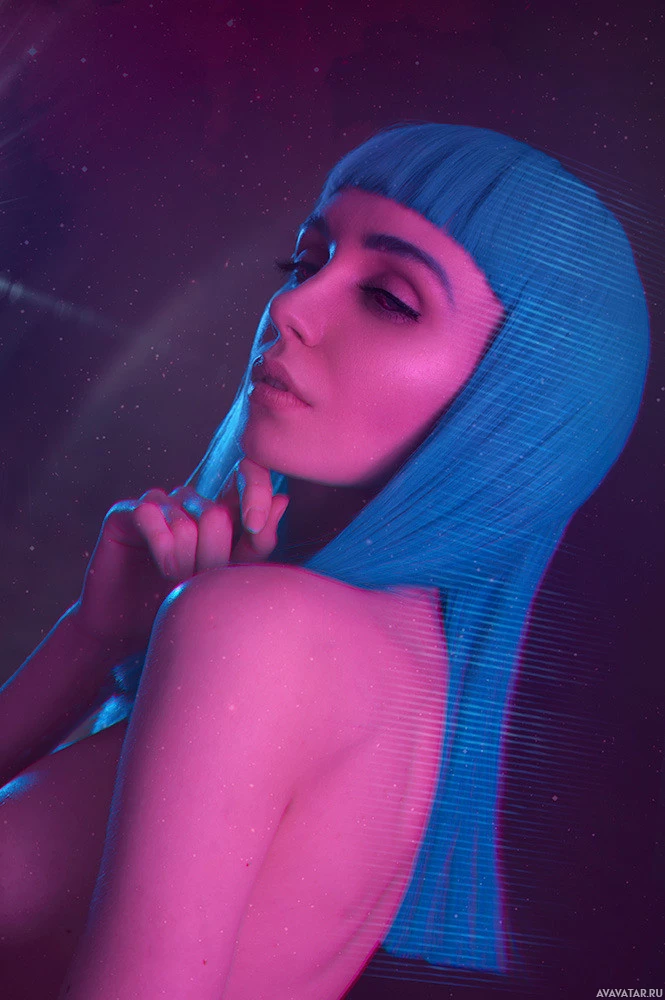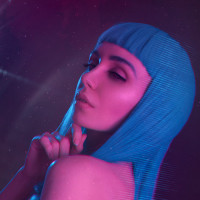 blue hair, possibly wearing makeup that gives her a dramatic and artistic look. She is holding her chin thoughtfully and looking off to the side. Her pose and expression suggest she might be part of