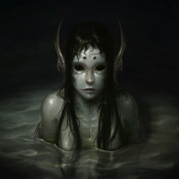a humanoid form but has scales instead of skin, and she has fish-like fins on her arms and tail, which are typical characteristics of a mermaid in folklore and mythology. The mermaid appears to be sitting or lying at the bottom of
