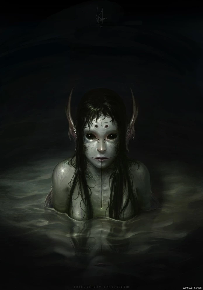dark hair that flows into the water around her, creating an ethereal and mysterious atmosphere. This kind of imagery is commonly associated with