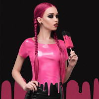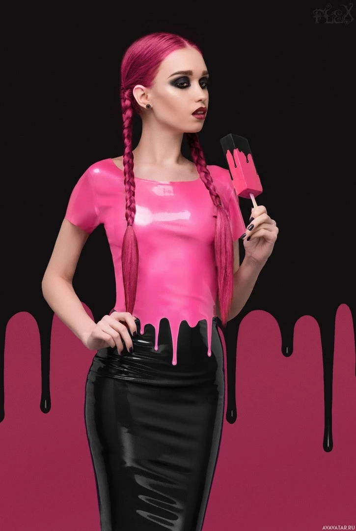 latex dress that appears to have pink splatters on it. In her hand, she holds