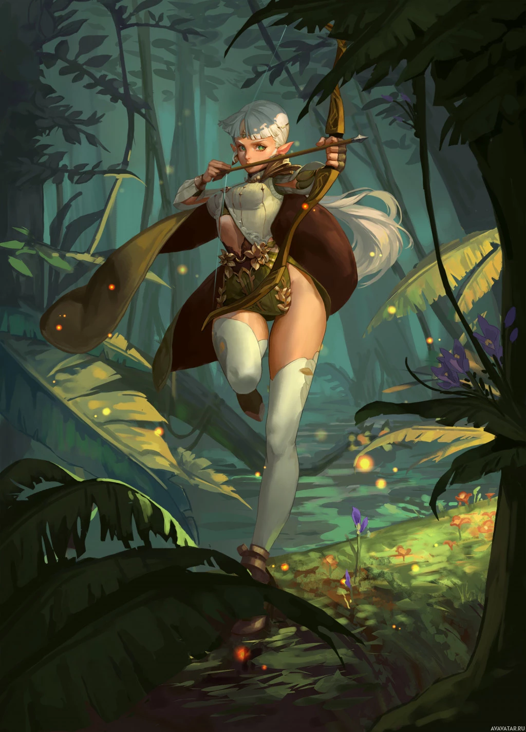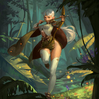 a fantasy setting, and her pose indicates she might be engaged in some kind of action or adventure. In the background, there are forest elements such as trees and leaves, which reinforces the fantasy theme. The character is holding a bow and arrow, indicating her role may involve archery, possibly as part of hunting or battle within the narrative context of her world.