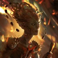 a chaotic scene with fire and destruction, which could imply a battlefield or a place under siege. Her expression is intense and focused, which contributes to the overall dramatic and fantastical atmosphere of the artwork.