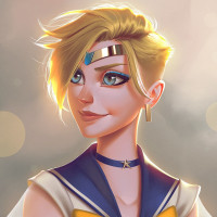 The image features an illustrated character that appears to be a female with short hair and a noticeable scar on her forehead. She is wearing what looks like a sailor-style outfit, complete with a bow in the back, which is often associated with anime or manga characters. The background has a warm, sunlit quality to it, suggesting a serene setting.