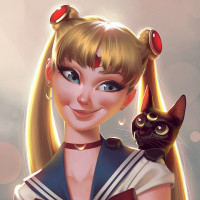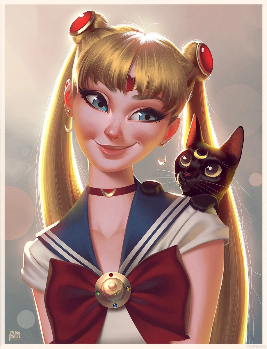 blonde hair styled with two long buns, blue eyes, and is wearing a sailor suit adorned with a crescent moon on her forehead, a single star on her left side, and what appears to be the Sailor Moon emblem on her chest. She also has