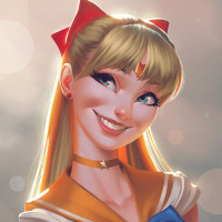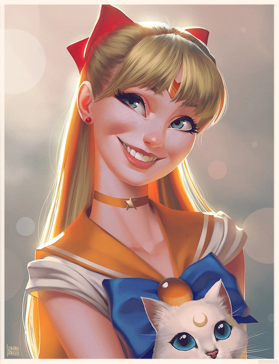 blonde hair and a bow in her hair, which are characteristic features of her design. She is smiling, suggesting she is happy or content. Additionally, there's a cat-like creature with