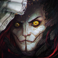 a noticeable scar across the face. The character is adorned with what appears to be feathers or similar accessories, and there are dark elements around the character, like black veins or tendrils coming from the head, which adds to the eerie and possibly
