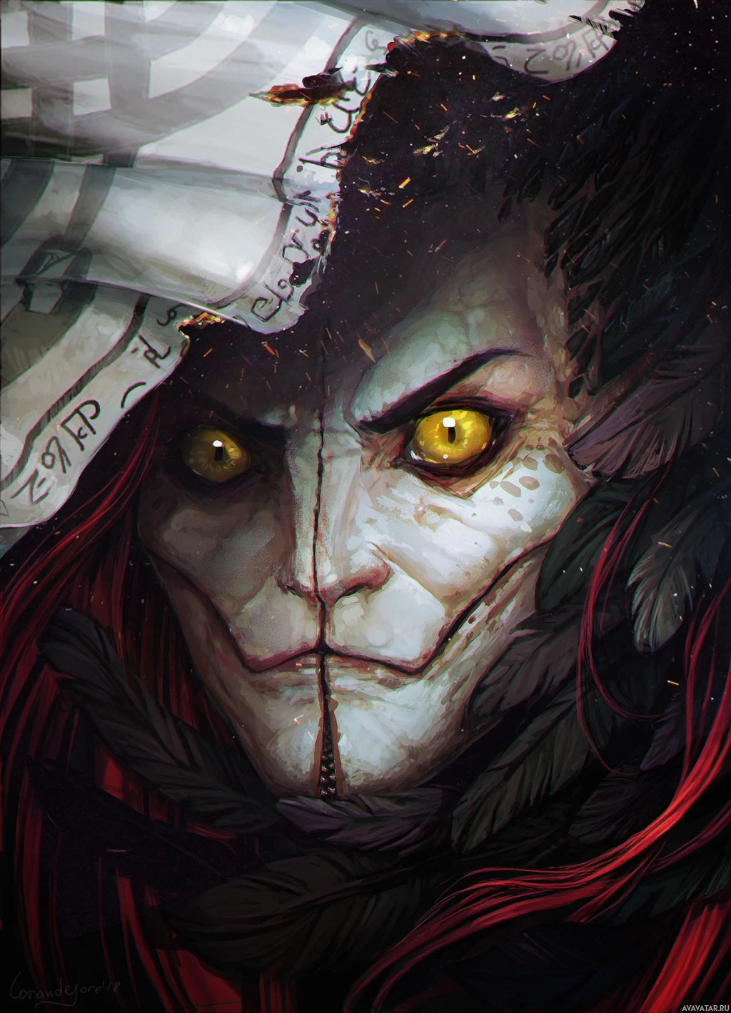 The image depicts a fantasy or horror-themed artwork of a character with striking features. This character has