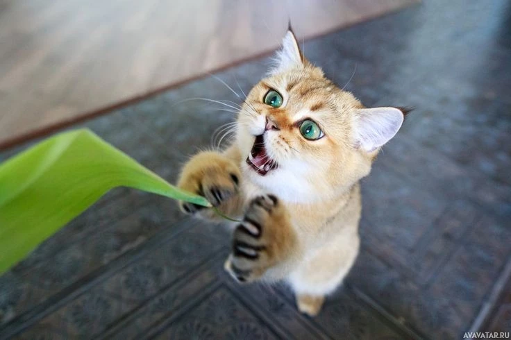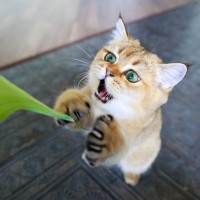 particular cat seems engaged in some form of play or exploration, possibly with a toy or an object it has found interesting. The cat's coloring includes shades of tan, white, and what might be green or yellow on its face and